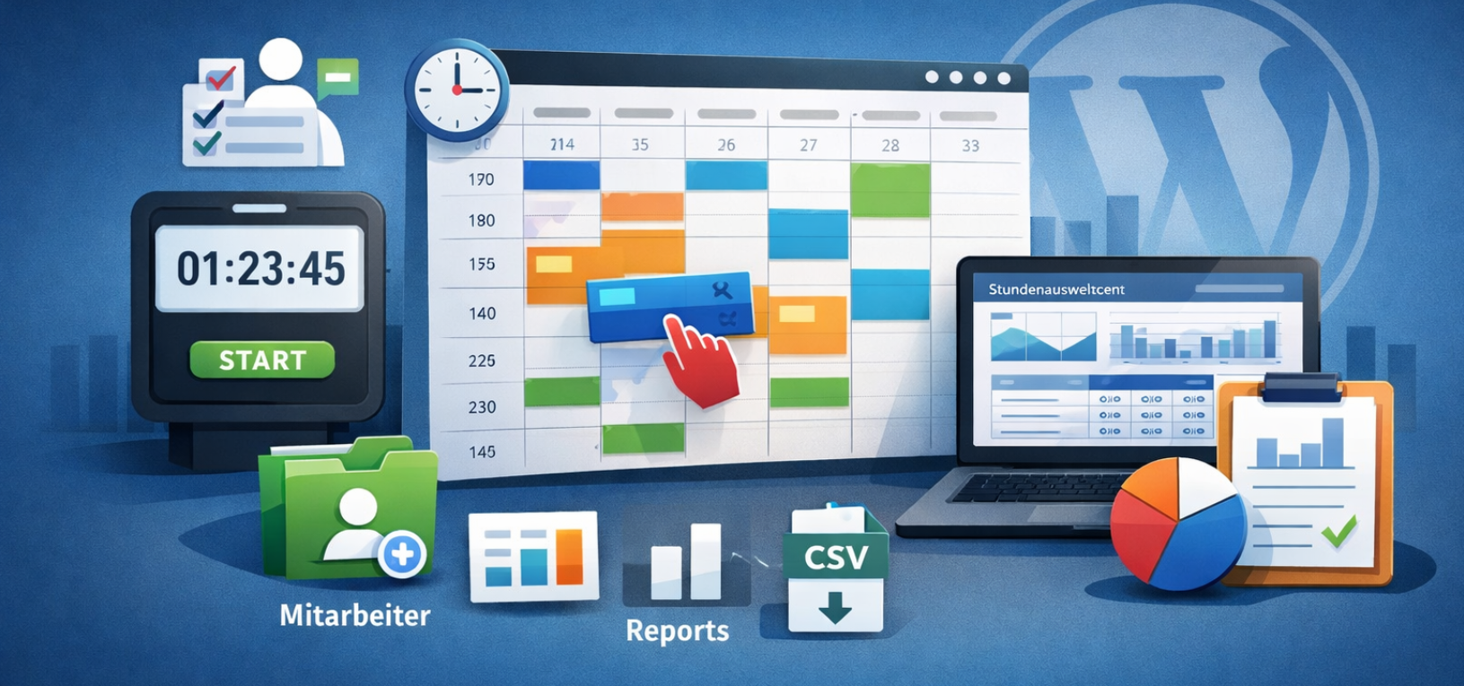 Das Plugin soll es ermöglichen, Arbeitszeiten direkt in WordPress zu erfassen, zu bearbeiten und auszuwerten.